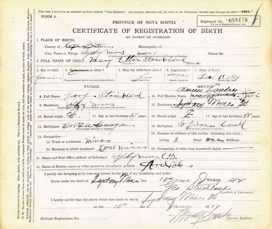 21. Name and Post Office address of Informant George Strickland Sydney Mines, Cape Breton