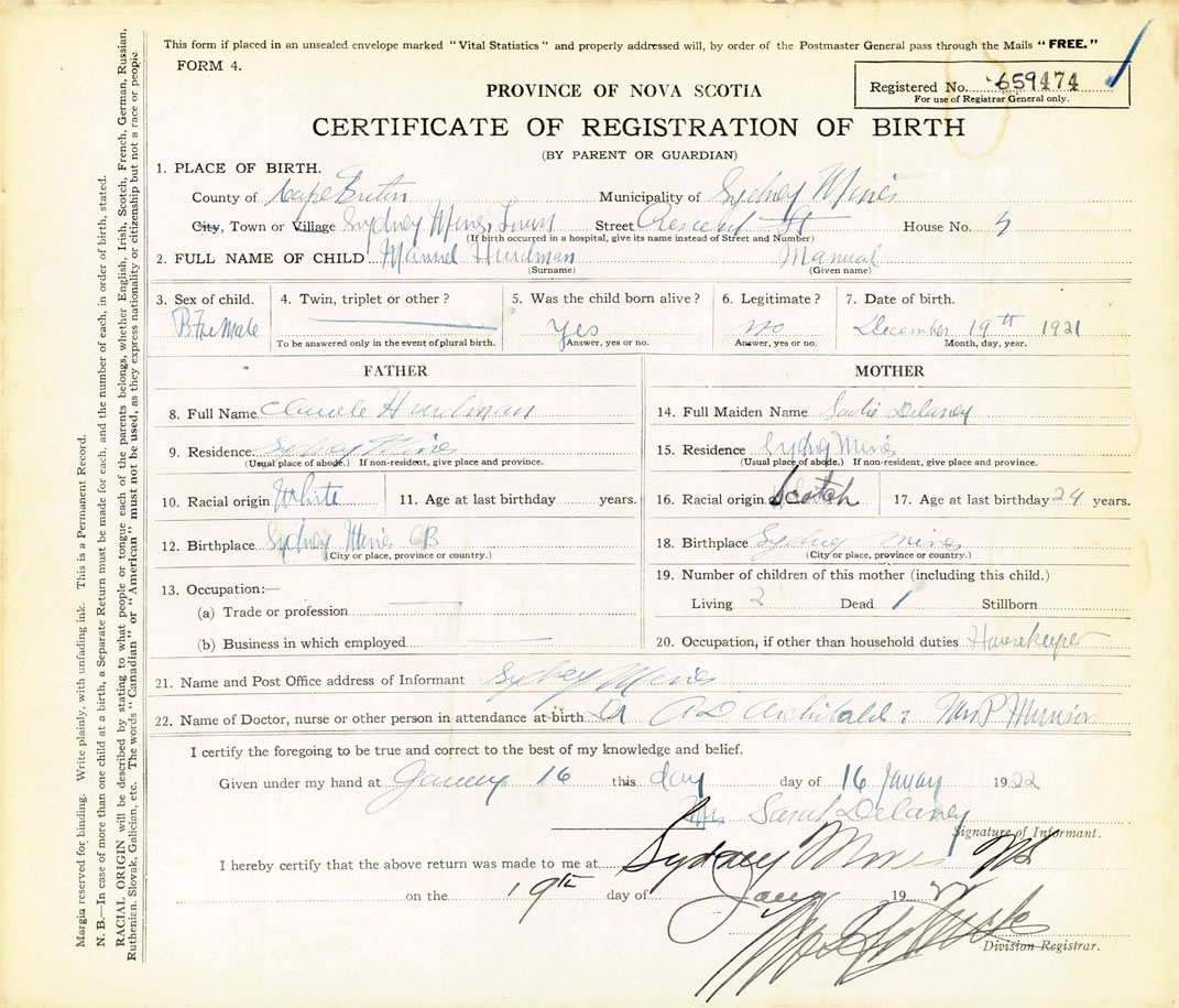 21. Name and Post Office address of Informant Sadie Delaney Sydney Mines