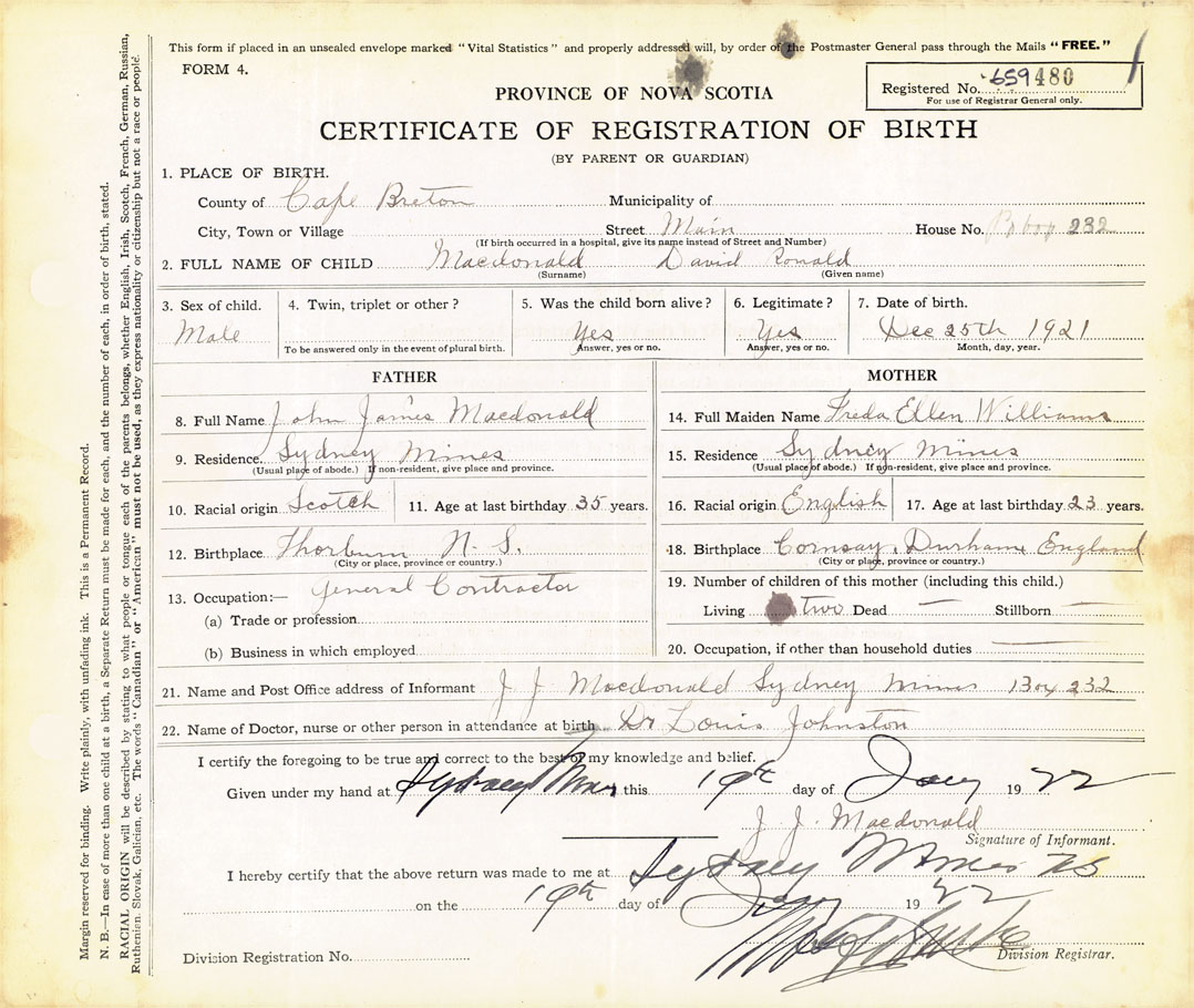 21. Name and Post Office address of Informant J. J. MacDonald Sydney Mines, Cape Breton Co., NS