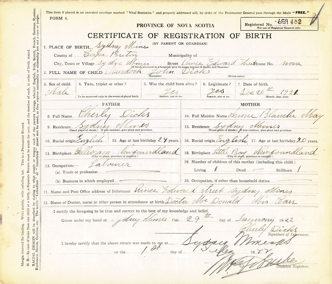 21. Name and Post Office address of Informant Prince Edward Street, Sydney Mines, Cape Breton