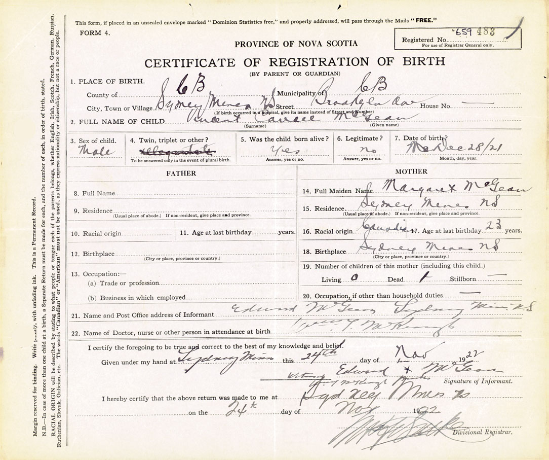 21. Name and Post Office address of Informant Edward McGean Sydney Mines, Cape Breton