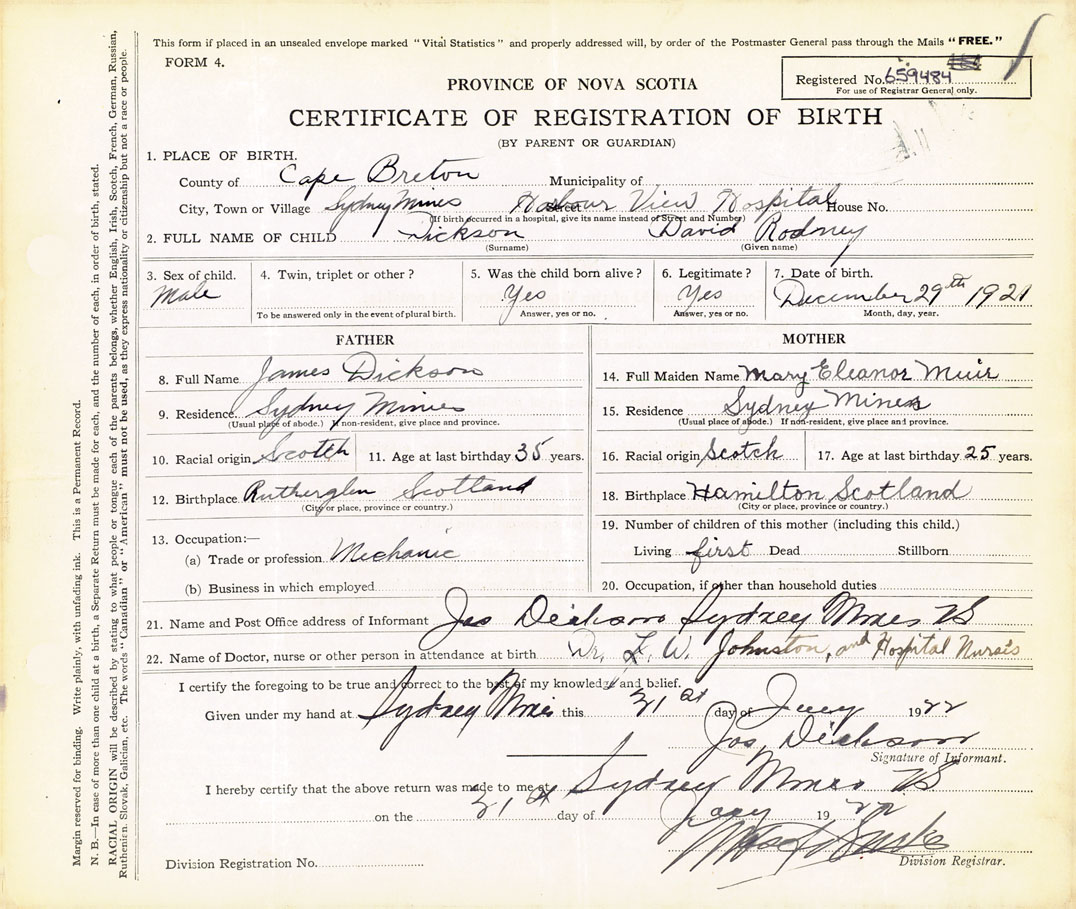 21. Name and Post Office address of Informant James Dickson Sydney Mines, Cape Breton