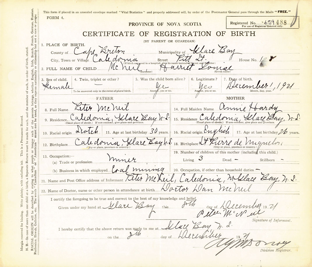21. Name and Post Office address of Informant Peter McNeil Caledonia, Glace Bay, CB