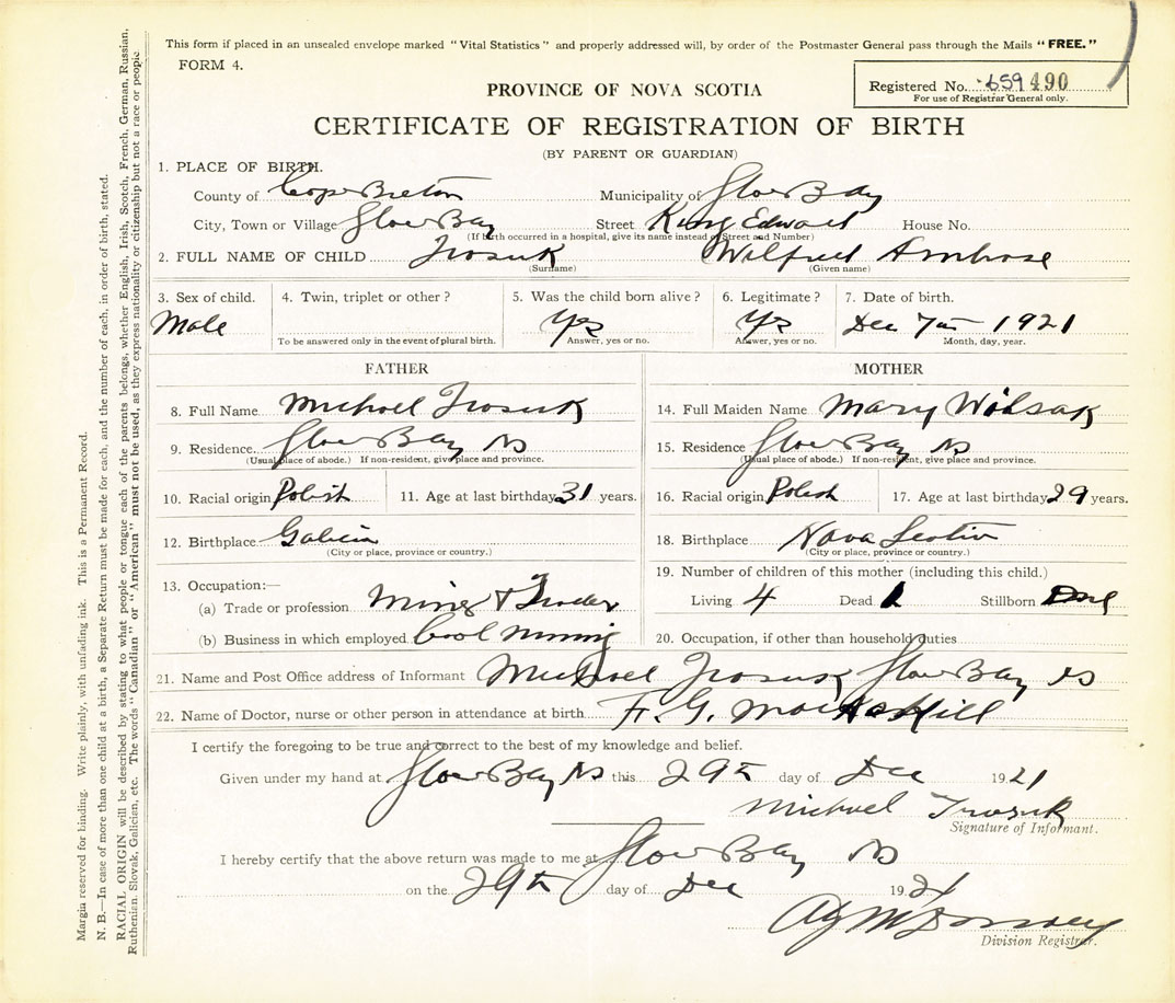 21. Name and Post Office address of Informant Michael Trosuk Glace Bay, Cape Breton