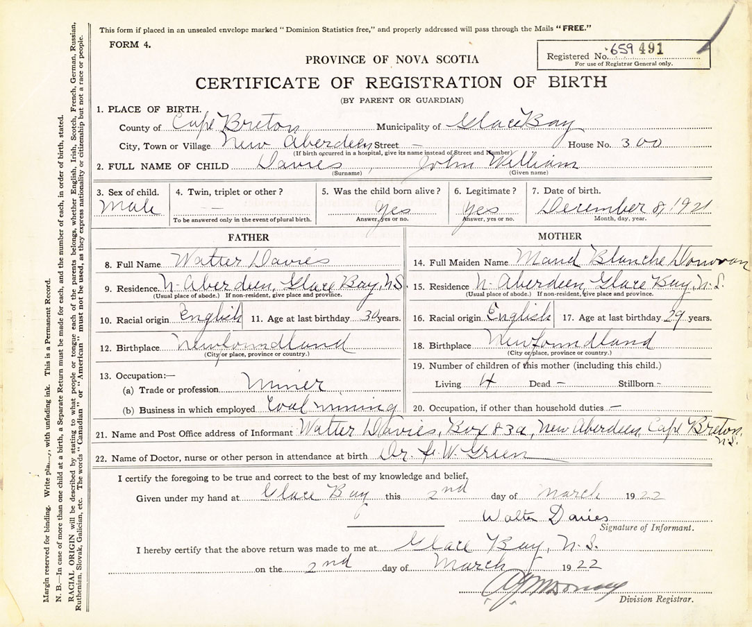 21. Name and Post Office address of Informant Walter Davies Box 83a, New Aberdeen, Glace Bay, Cape Breton