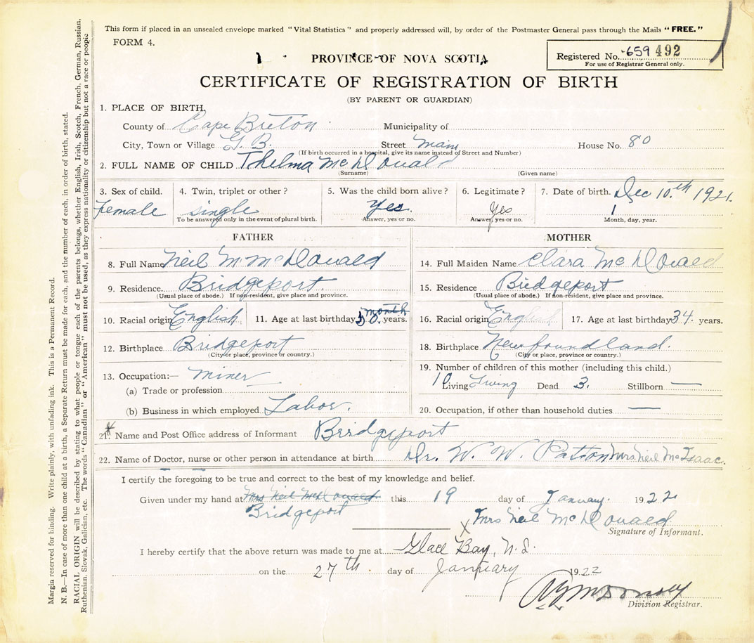 22. Name of Doctor, nurse or other person in attendance at birth Dr. W. W. Patton & Mrs. Neil McIsaac