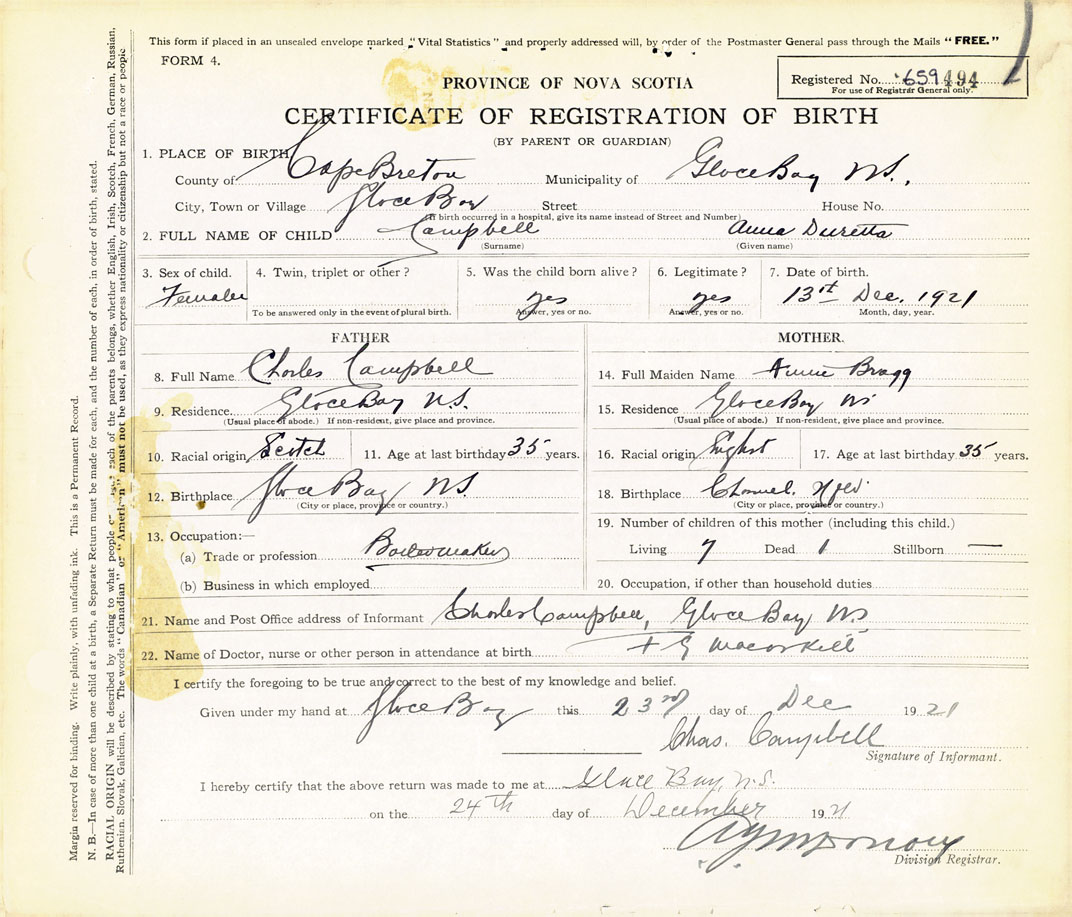 21. Name and Post Office address of Informant Charles Campbell Glace Bay, Cape Breton