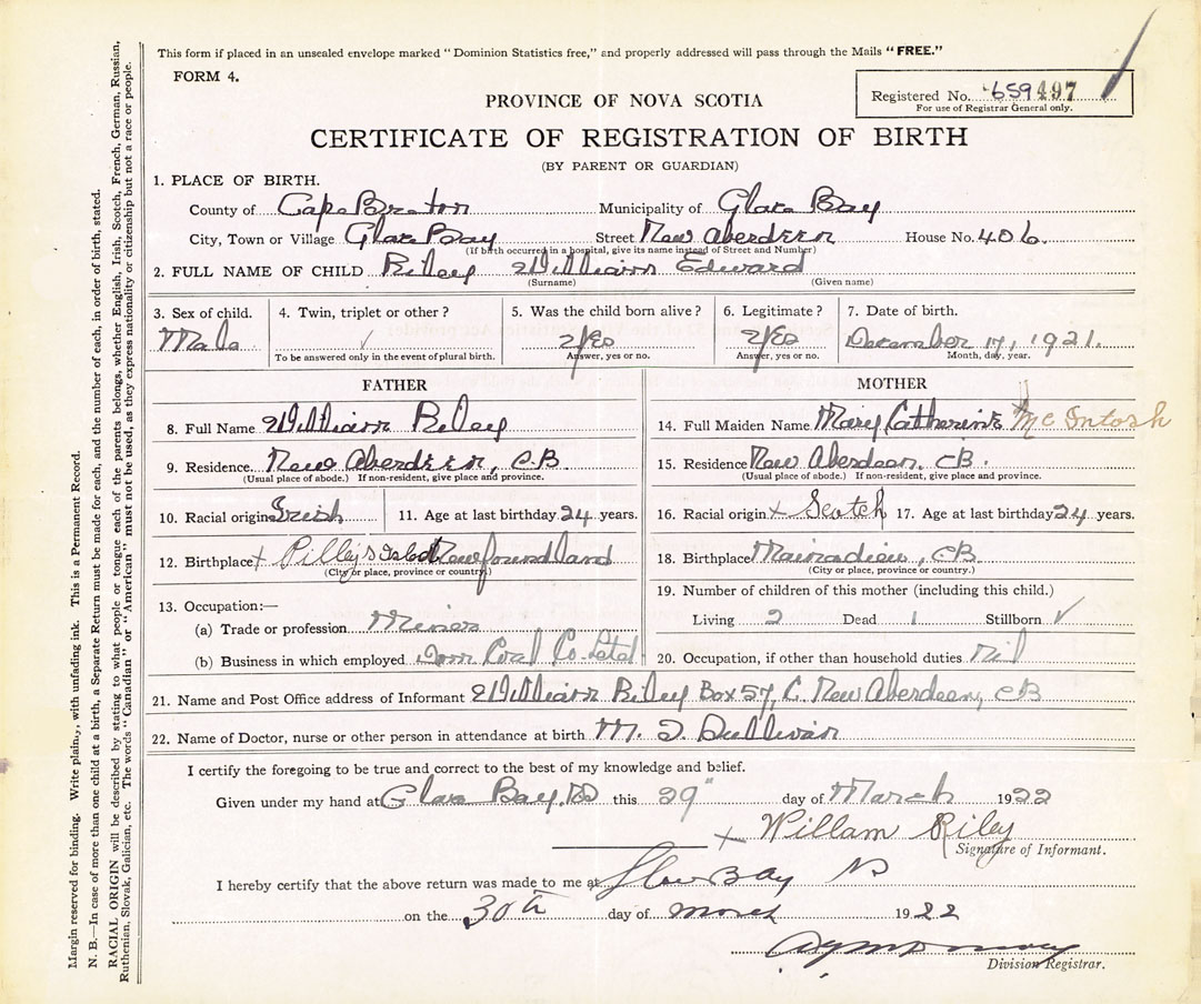 21. Name and Post Office address of Informant William Riley Box 57 C. New Aberdeen, Cape Breton