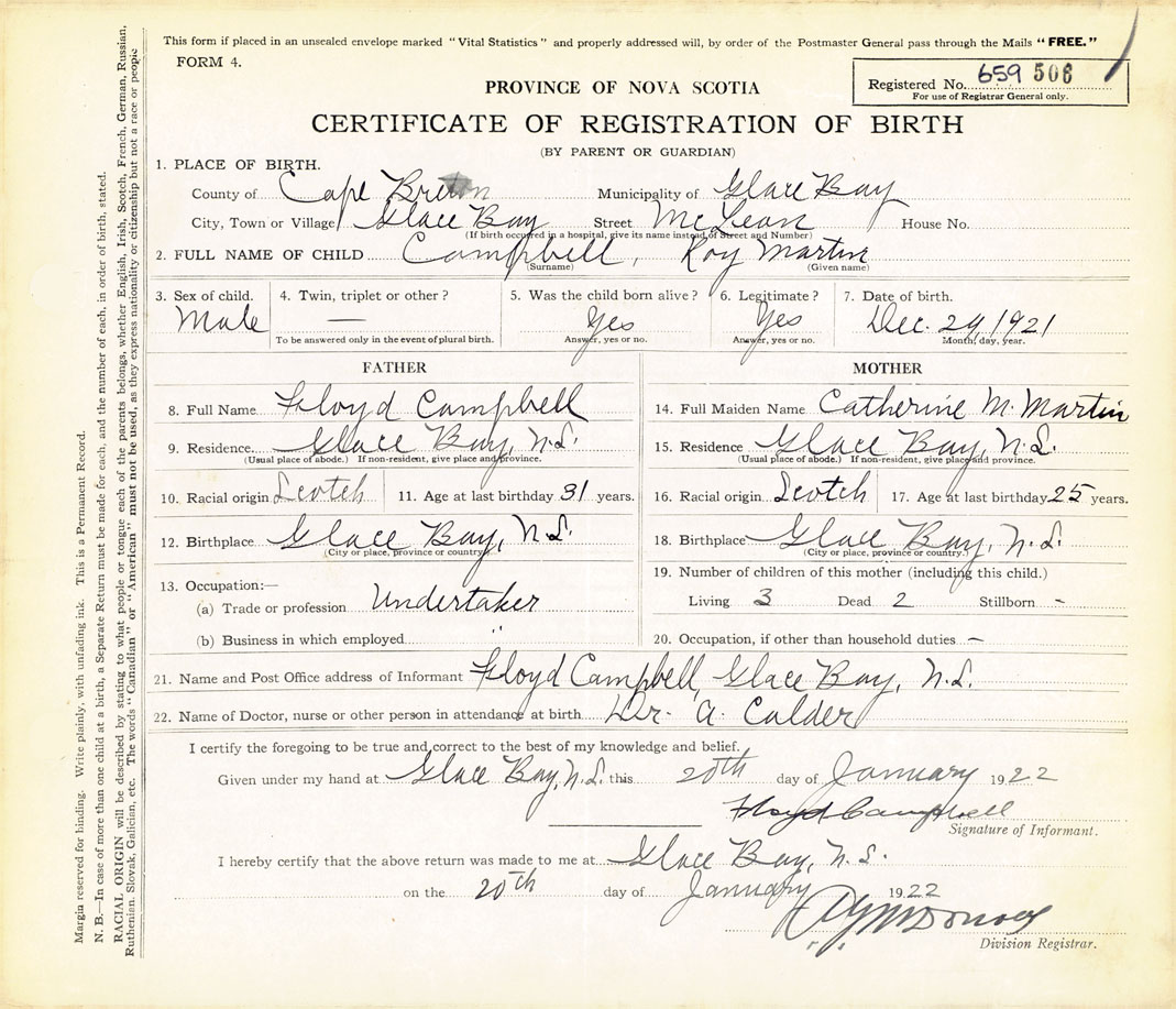 21. Name and Post Office address of Informant Floyd Campbell Glace Bay