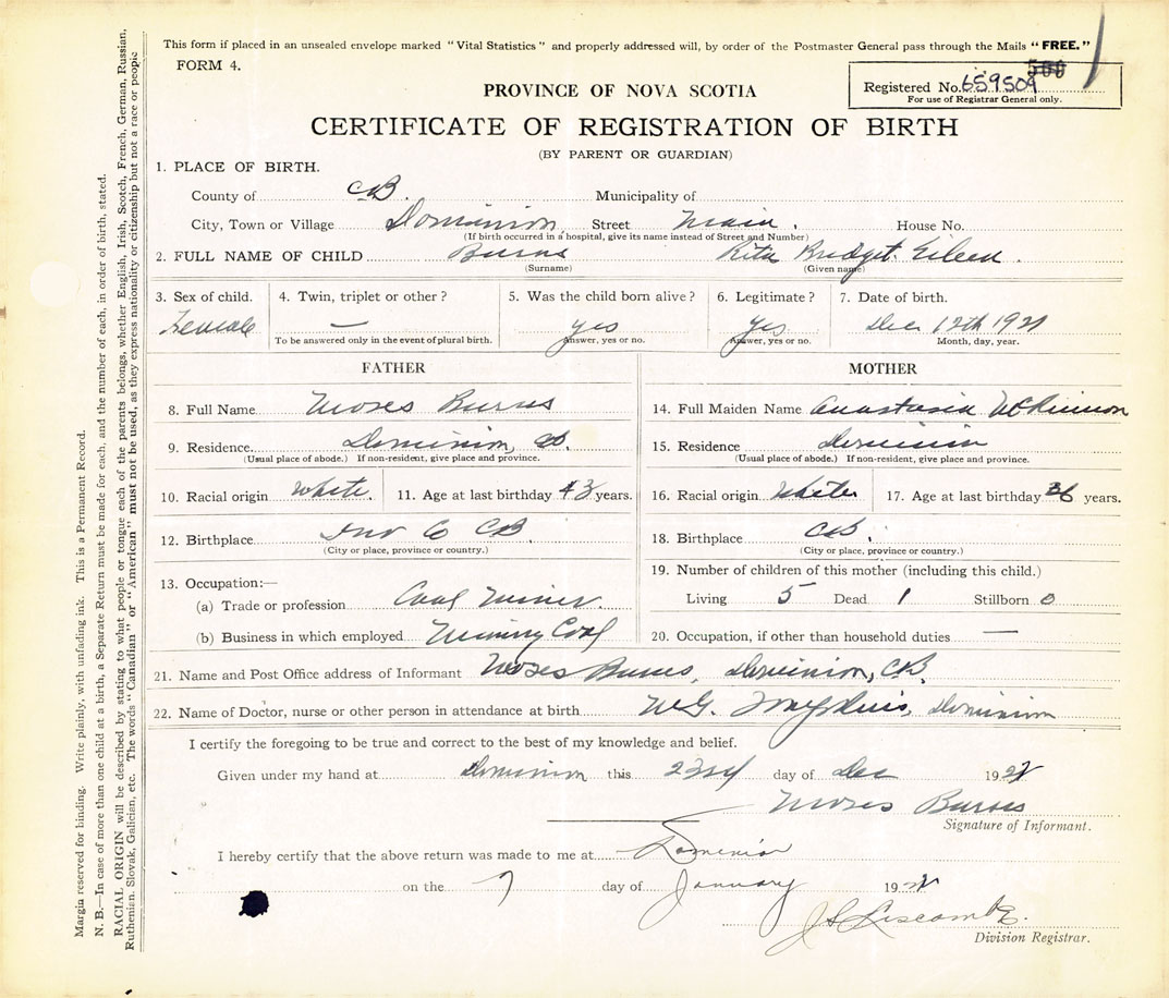 21. Name and Post Office address of Informant Moses Burns Dominion, Cape Breton