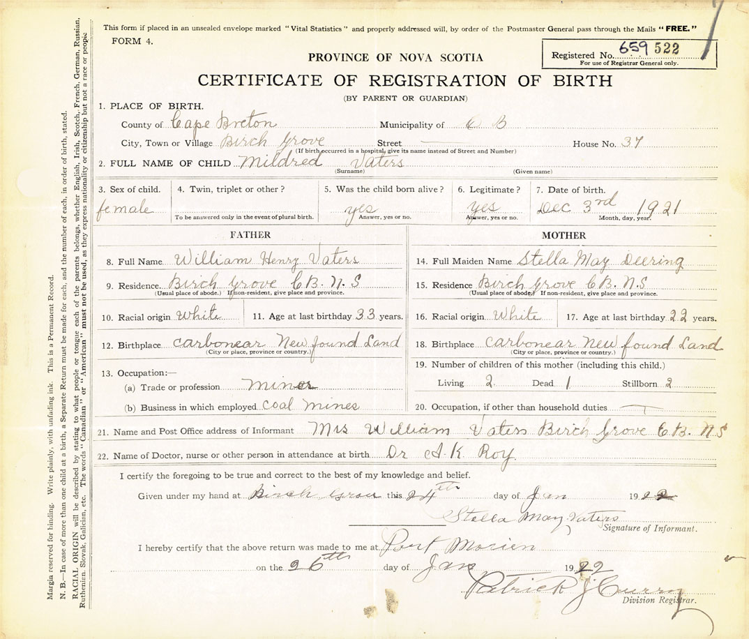 21. Name and Post Office address of Informant Mrs William Vaters Birch Grove, Cape Breton