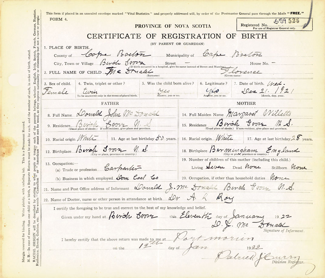 21. Name and Post Office address of Informant Donald J. McDonald Birch Grove, Cape Breton Co., NS