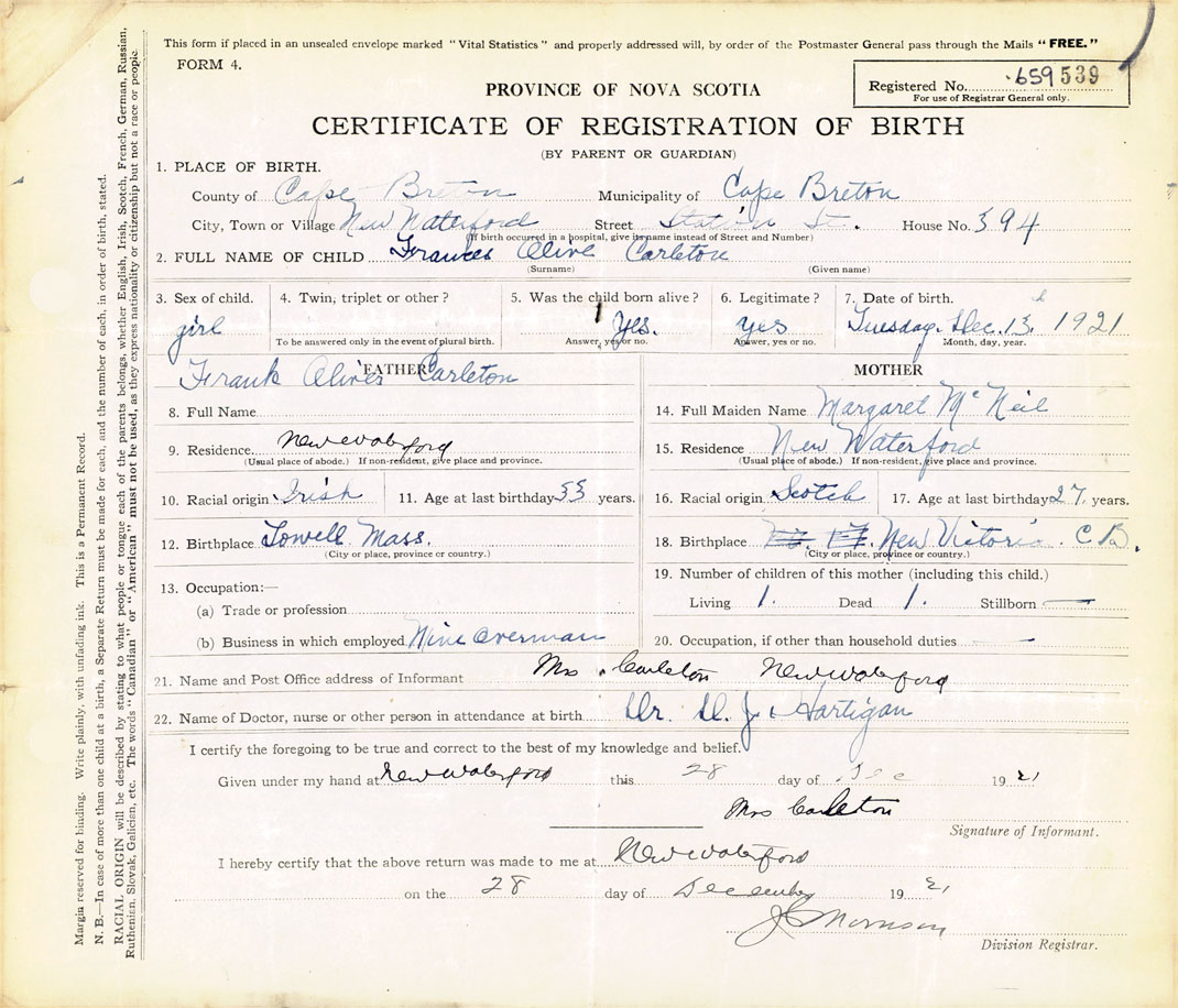 21. Name and Post Office address of Informant Mrs. Carleton New Waterford, Cape Breton