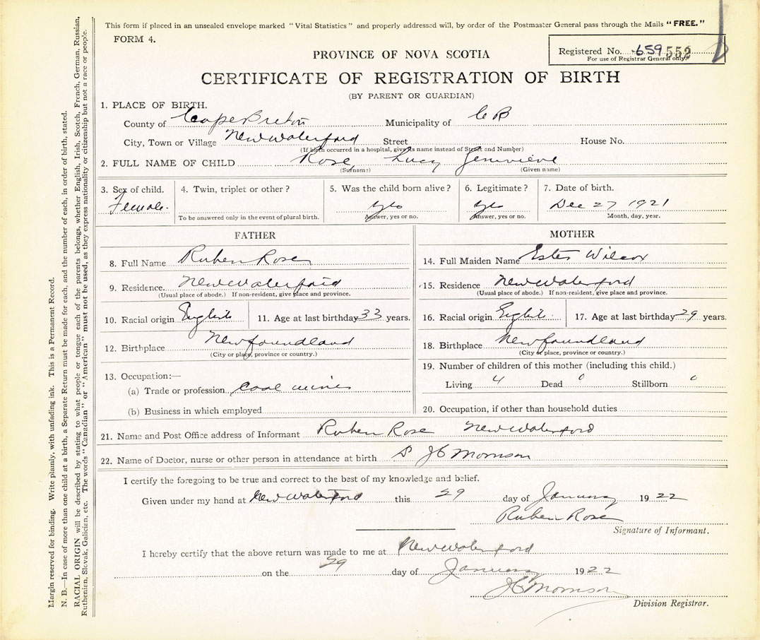 21. Name and Post Office address of Informant Ruben Rose New Waterford, Cape Breton