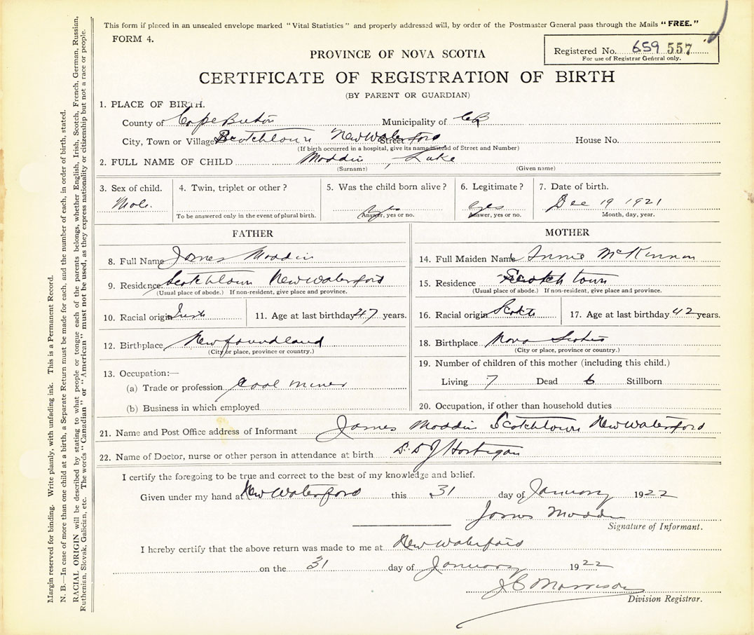 21. Name and Post Office address of Informant James Maddin Scotchtown, New Waterford, Cape Breton
