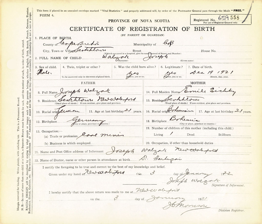 21. Name and Post Office address of Informant Joseph Walzak New Waterford, Cape Breton