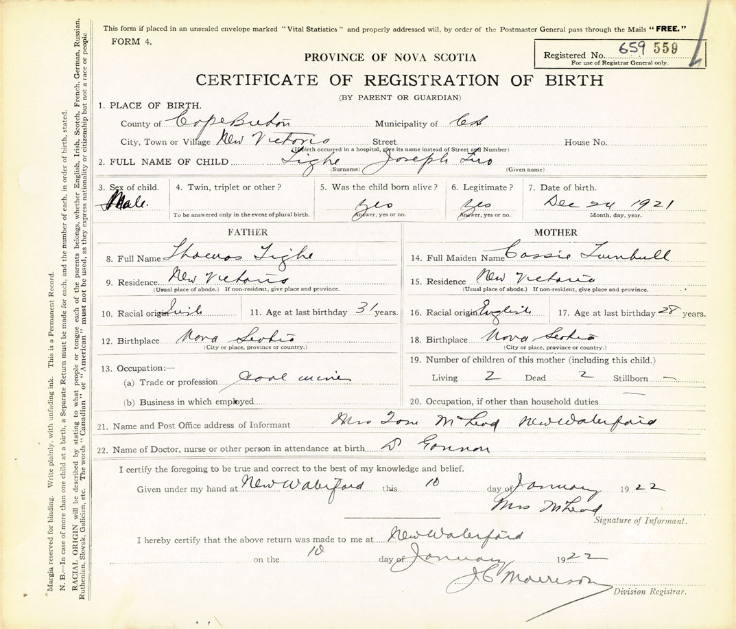 21. Name and Post Office address of Informant Mrs. Tom McLeod New Waterford, Cape Breton