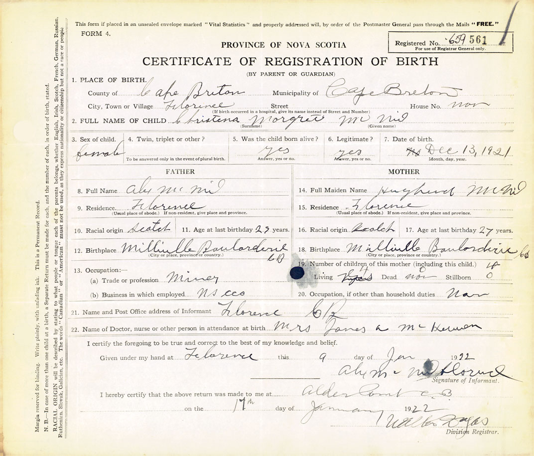21. Name and Post Office address of Informant Florence, Cape Breton