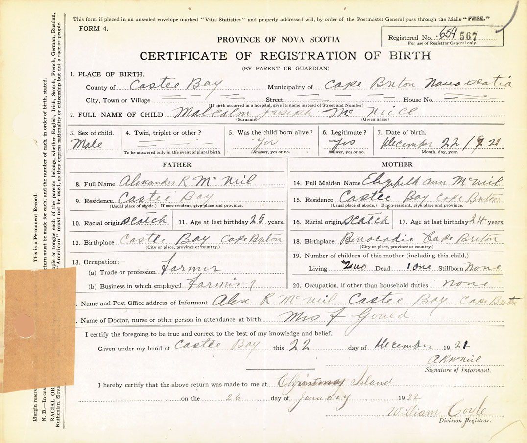 21. Name and Post Office address of Informant Alex R. McNeil Castle Bay, Cape Breton