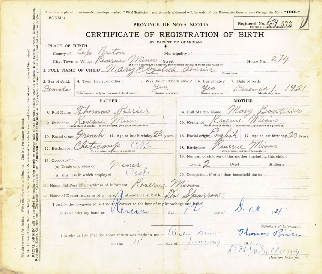 21. Name and Post Office address of Informant Reserve Mines, Cape Breton