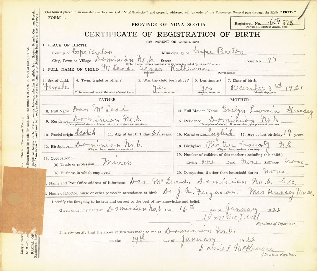 21. Name and Post Office address of Informant Dan McLeod Dominion No. 6, Cape Breton