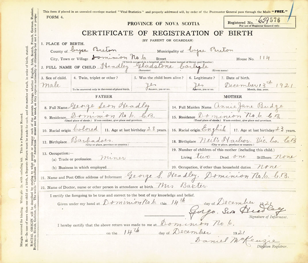 21. Name and Post Office address of Informant George S. Headley Dominion No. 6, Cape Breton