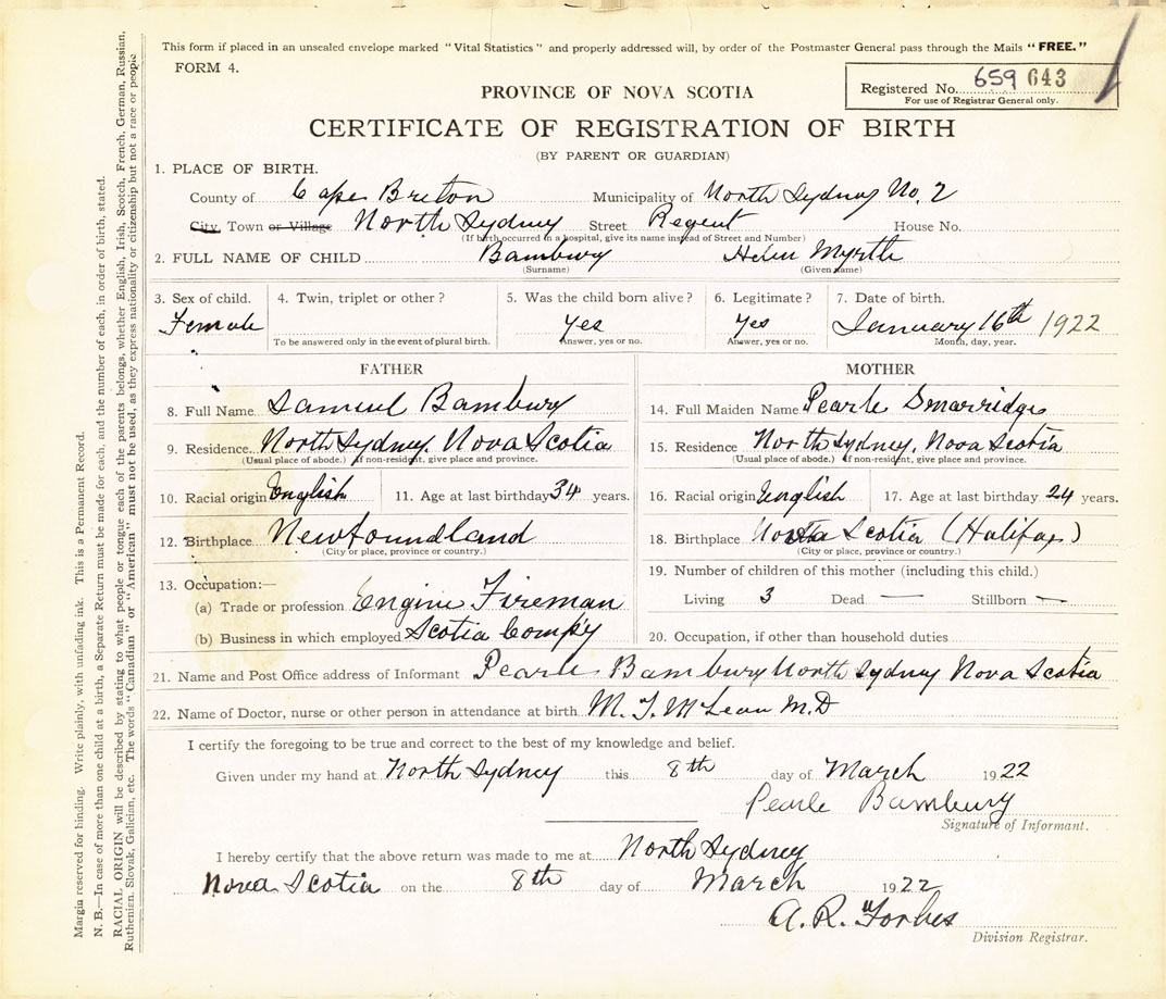 21. Name and Post Office address of Informant Pearle Bamburg North Sydney, Cape Breton