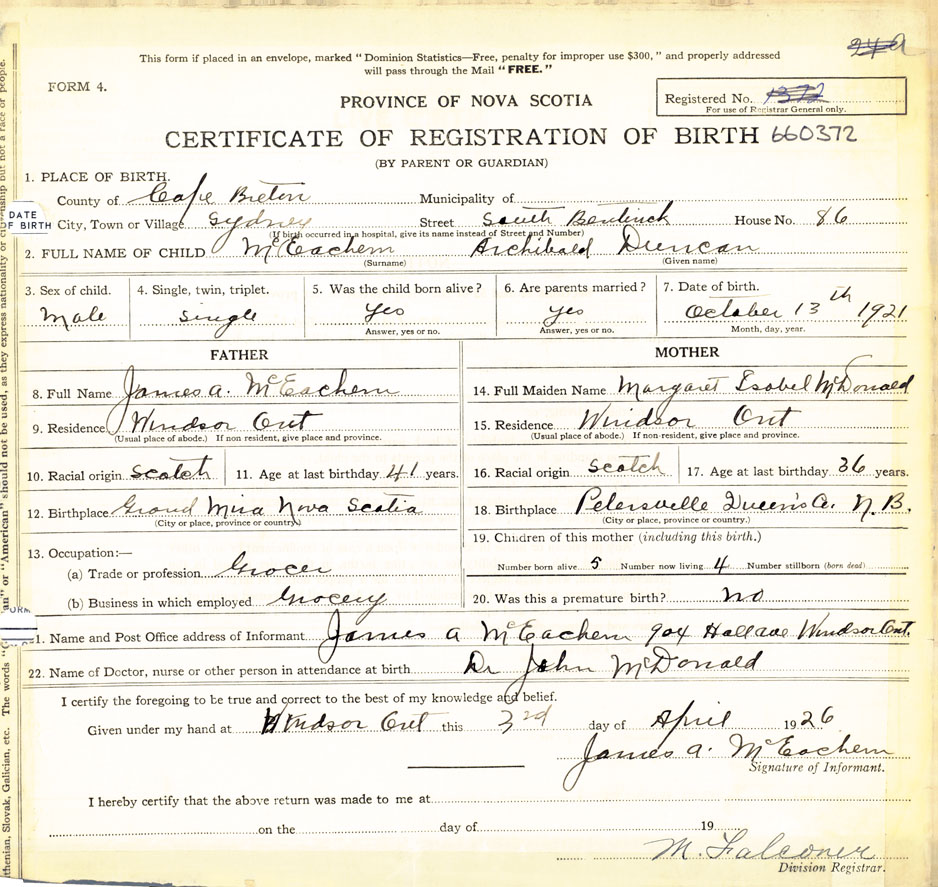 2. FULL NAME OF CHILD McEachern, Archibald Duncan