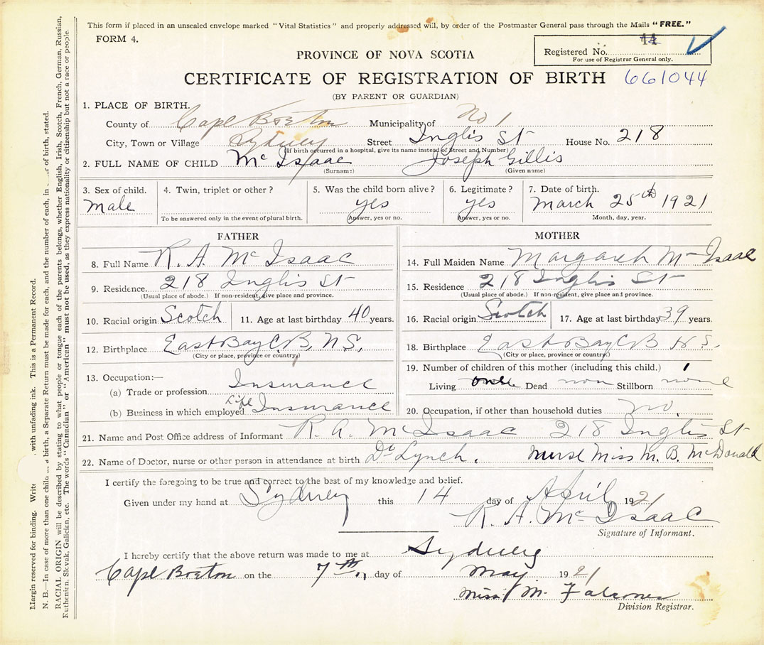 21. Name and Post Office address of Informant R. A. McIsaac 218 Inglis Street, Sydney, Cape Breton