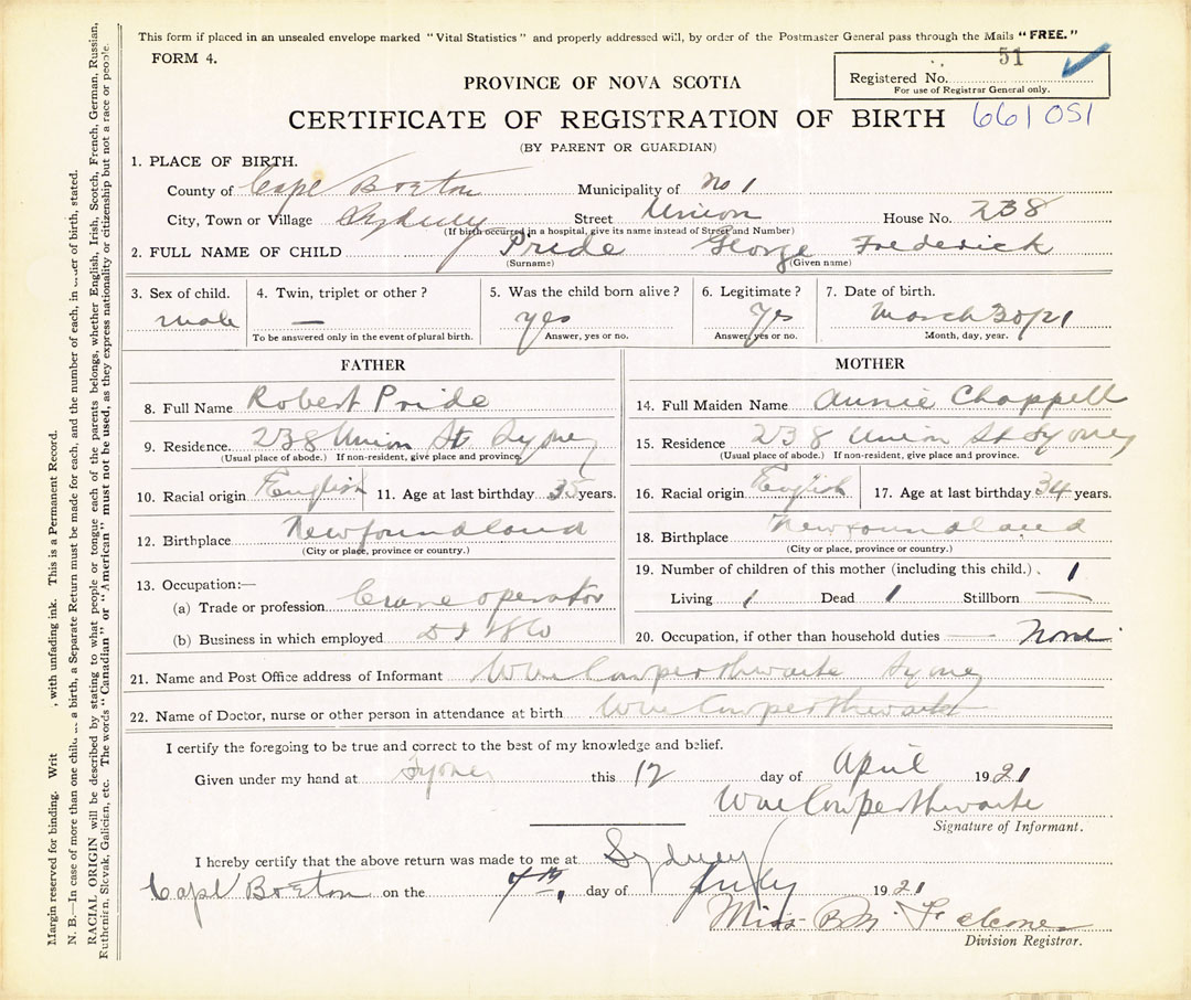 21. Name and Post Office address of Informant W. M. Cowperthwaite Sydney, Cape Breton