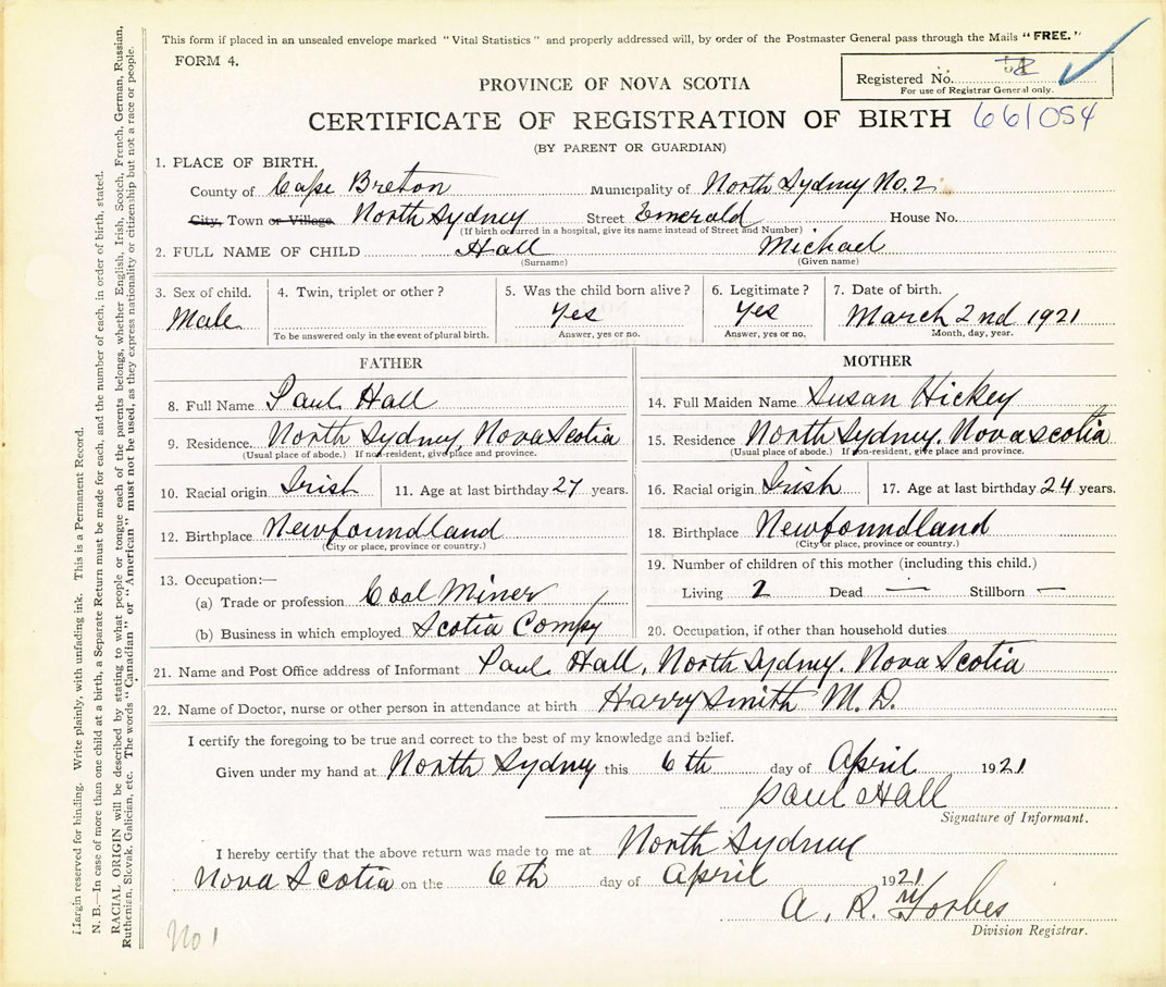 21. Name and Post Office address of Informant Paul Hall North Sydney, Cape Breton