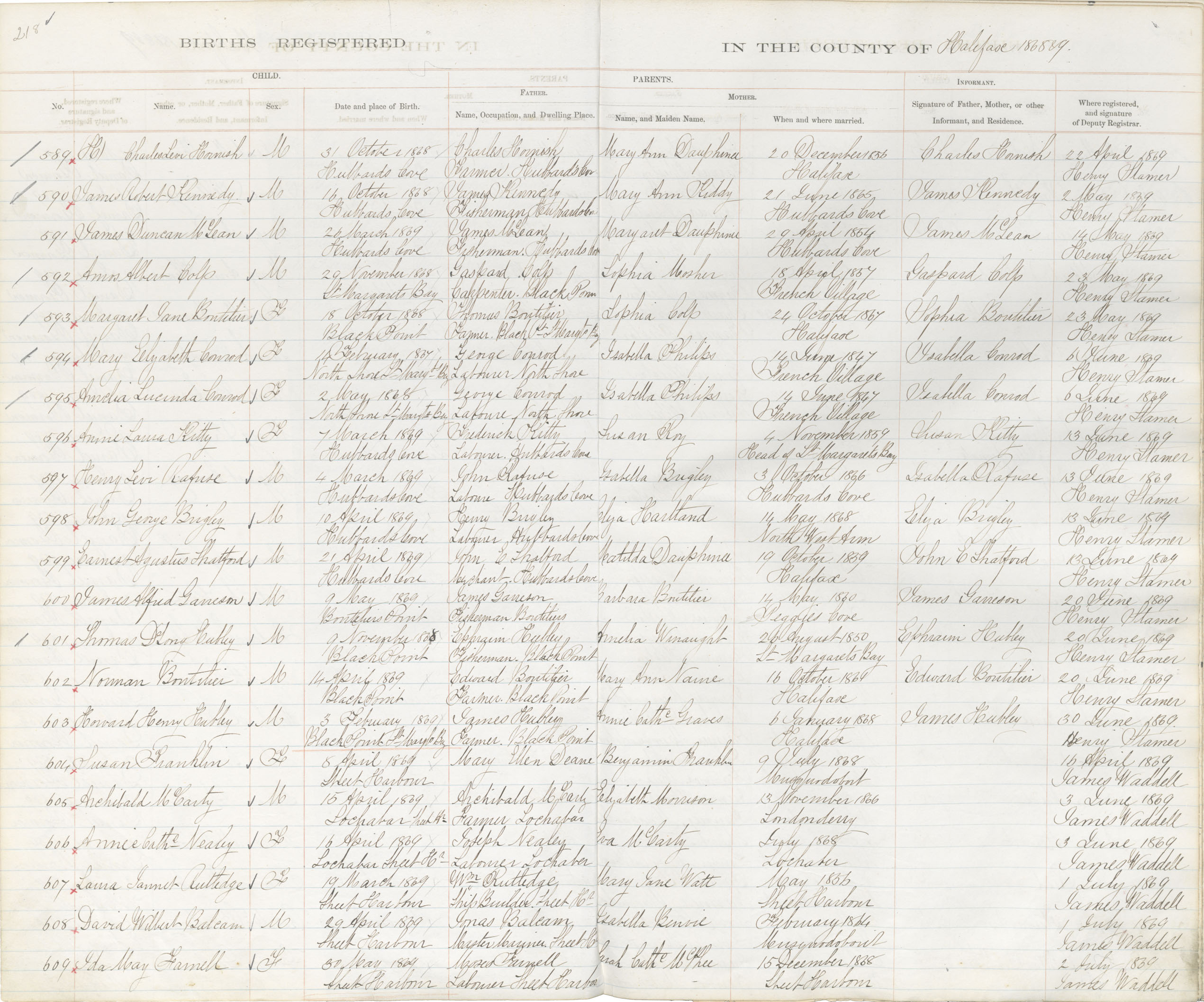 Birth Registration: Year: 1868 book: 1809 page: 218 number: 589