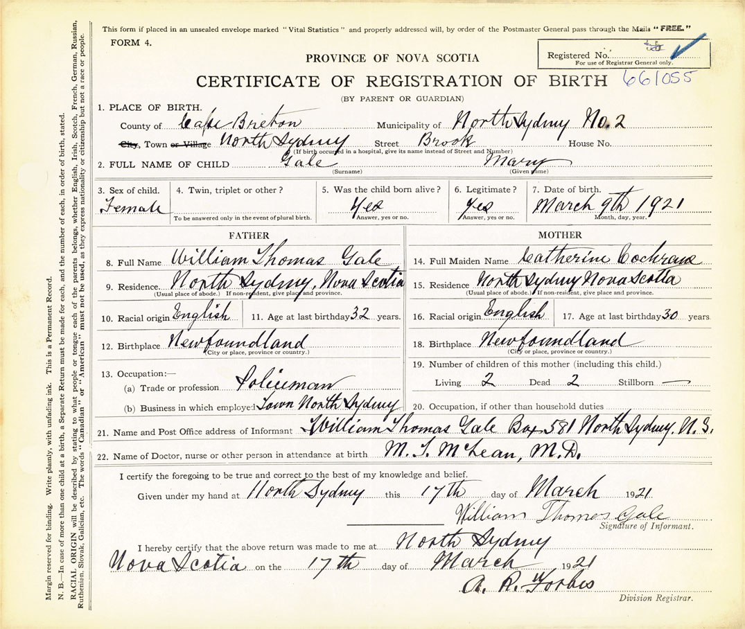 Female Birth Registration: Year: 1921 number: 66100055