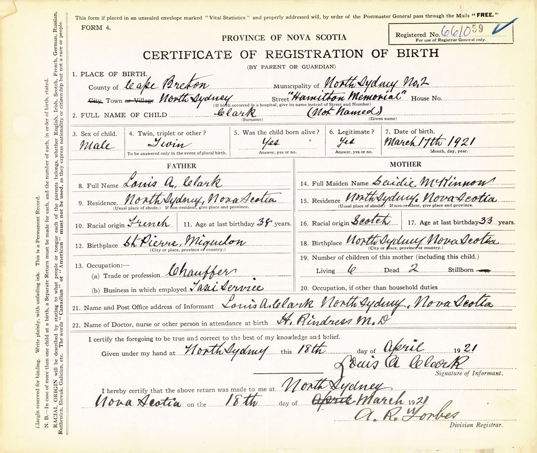 21. Name and Post Office address of Informant Louis A. Clark North Sydney, Cape Breton