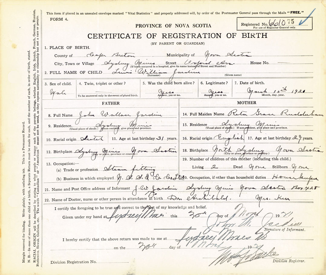 21. Name and Post Office address of Informant J. W. Jardine Sydney Mines, Cape Breton
