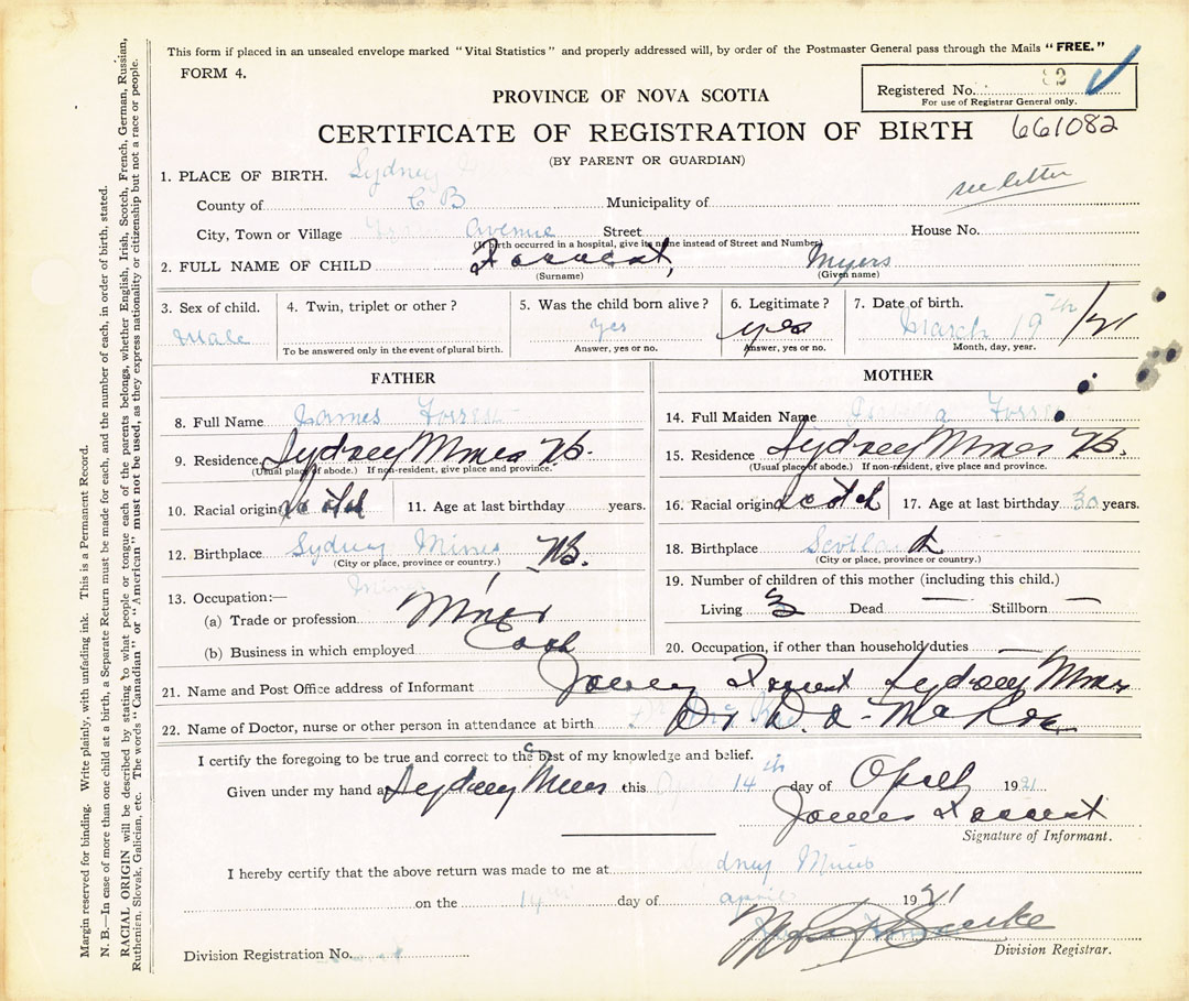 12. Birthplace Sydney Mines, Cape Breton Co., NS