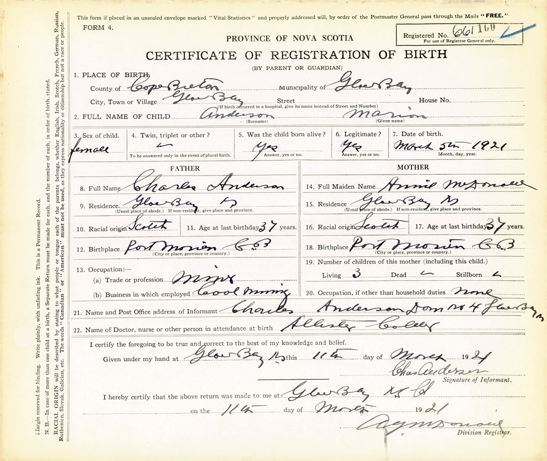 21. Name and Post Office address of Informant Charles Anderson Dominion No. 4, Glace Bay, Cape Breton