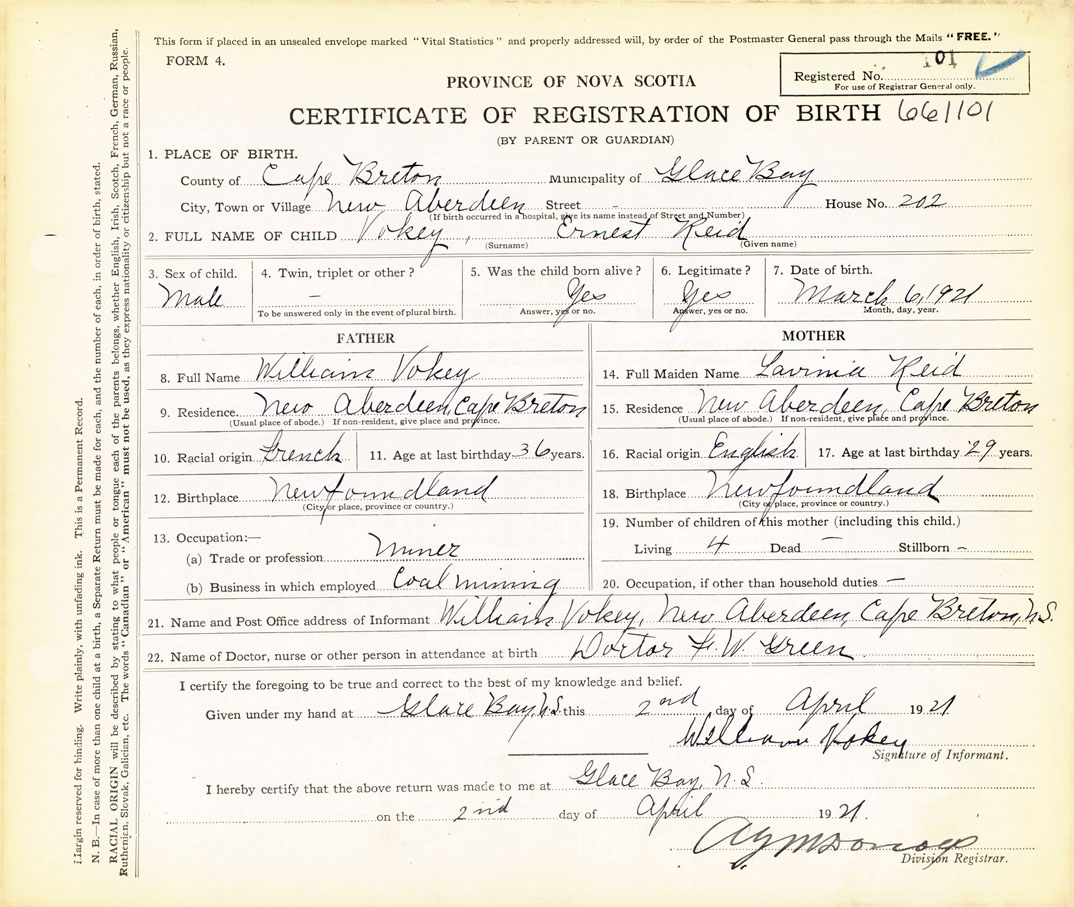 21. Name and Post Office address of Informant William Vokey New Aberdeen, Cape Breton