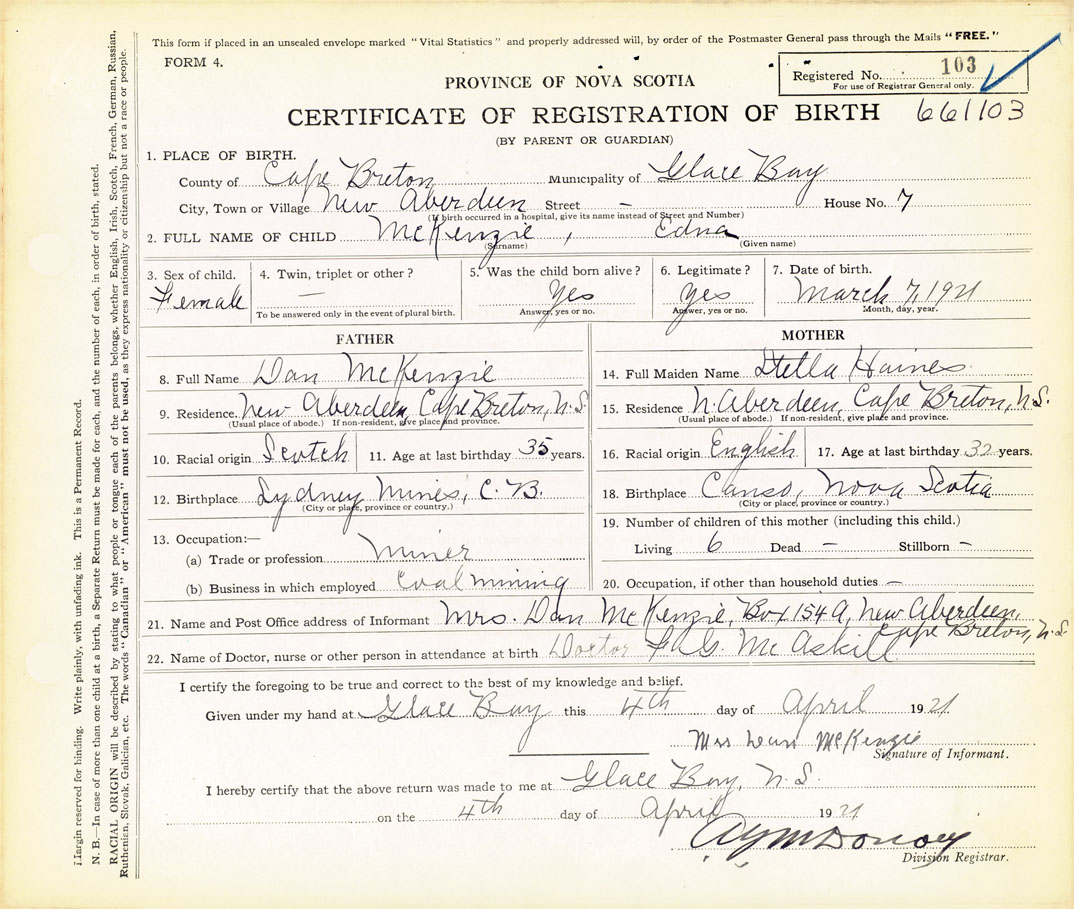 21. Name and Post Office address of Informant Mrs. Dan McKenzie Box 154A, New Aberdeen, Cape Breton, N.S.