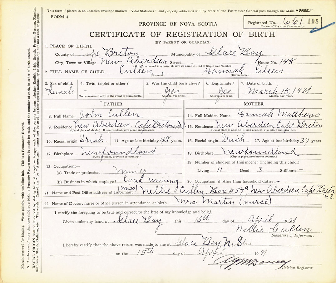 21. Name and Post Office address of Informant MISS N ELLIE CULLEN BOX 57a NEW ABERDEEN CAPE BRETON