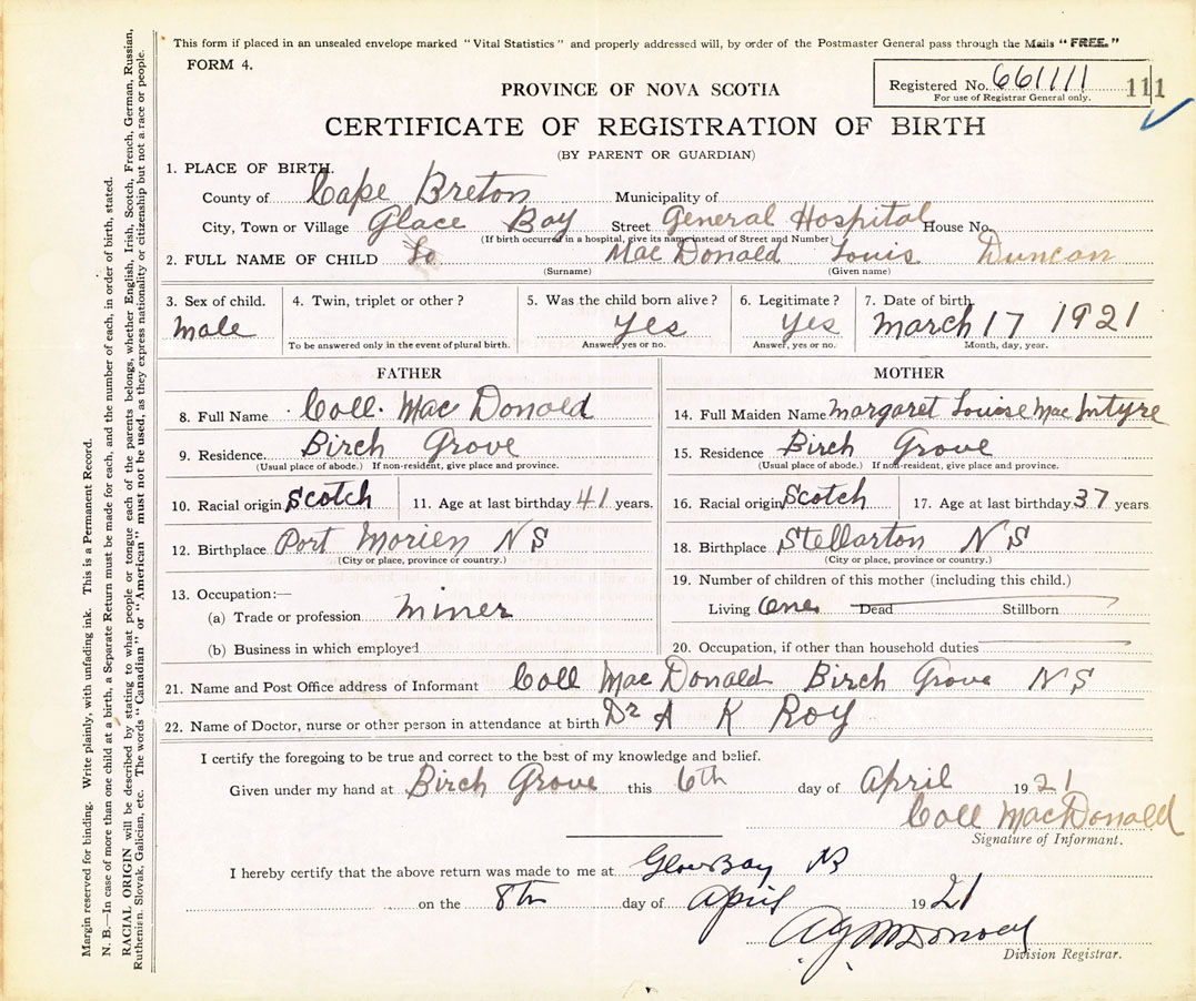 21. Name and Post Office address of Informant Call MacDonald Birch Grove, N.S.