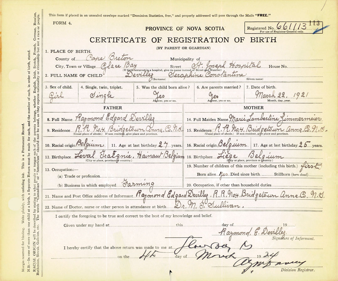 21. Name and Post Office address of Informant Raymond Edgard Devillez RR #4, Bridgetown, Annapolis Co., NS