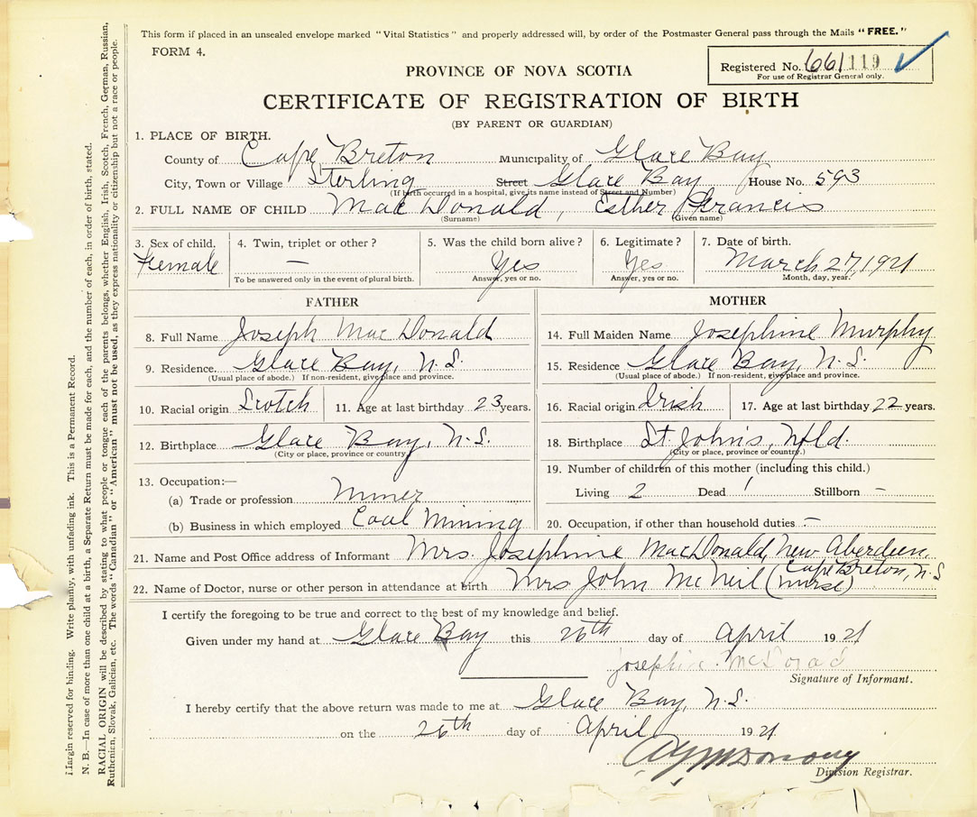 21. Name and Post Office address of Informant Mrs. Josephine MacDonald New Aberdeen, Cape Breton Co., NS