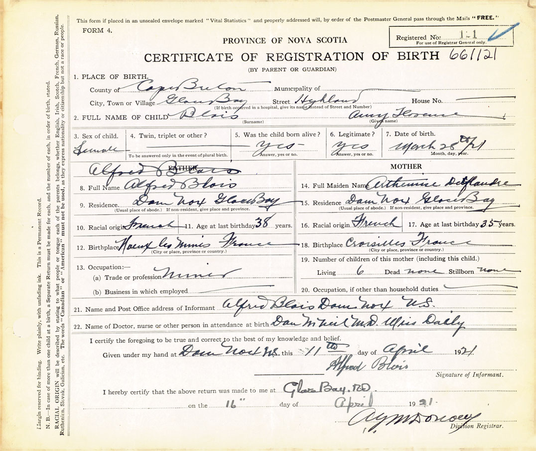 21. Name and Post Office address of Informant Alfred Blois Glace Bay