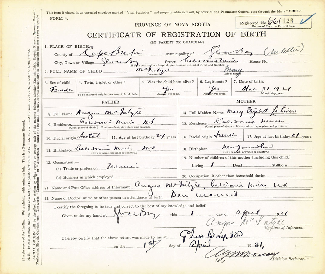 21. Name and Post Office address of Informant Angus McIntyre Caledonia Mines, Cape Breton
