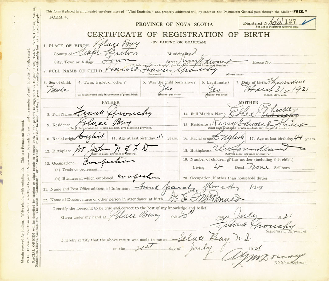 21. Name and Post Office address of Informant Frank Grouchy Glace Bay, Cape Breton