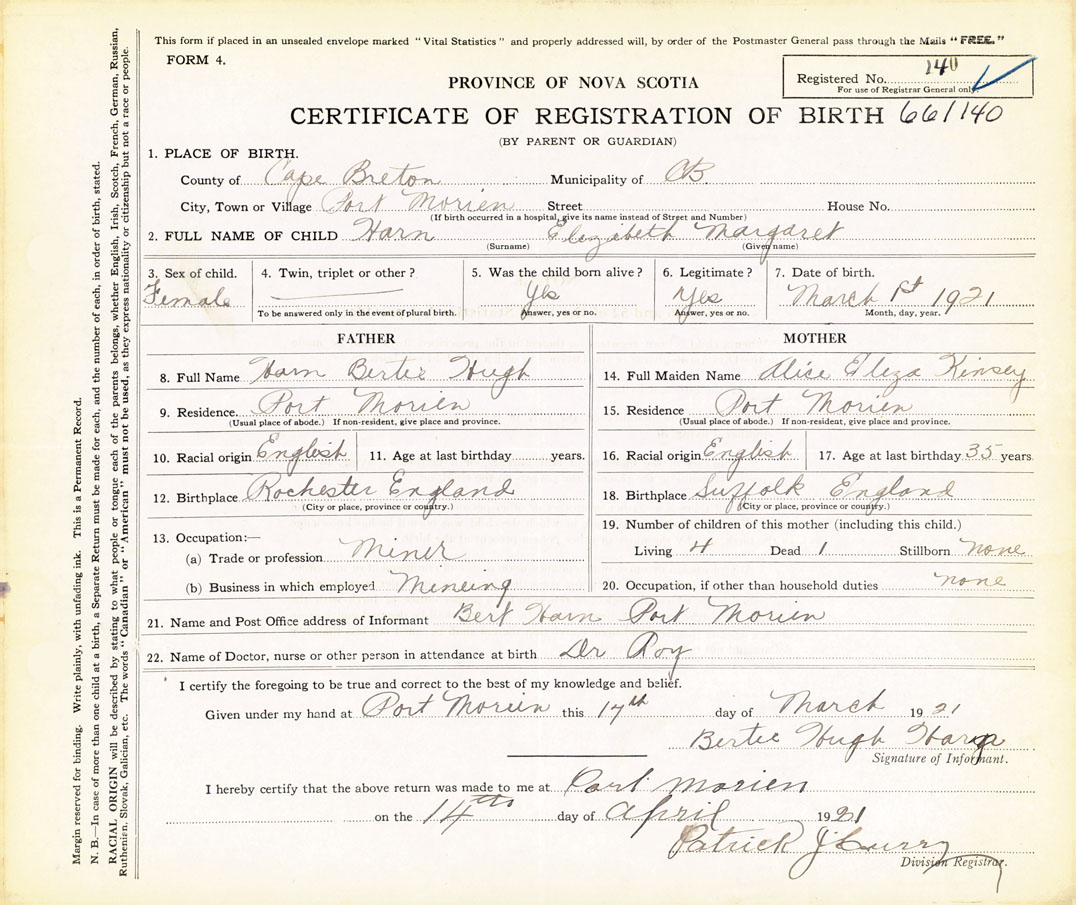 21. Name and Post Office address of Informant Bertie Hugh Harn Port Morien