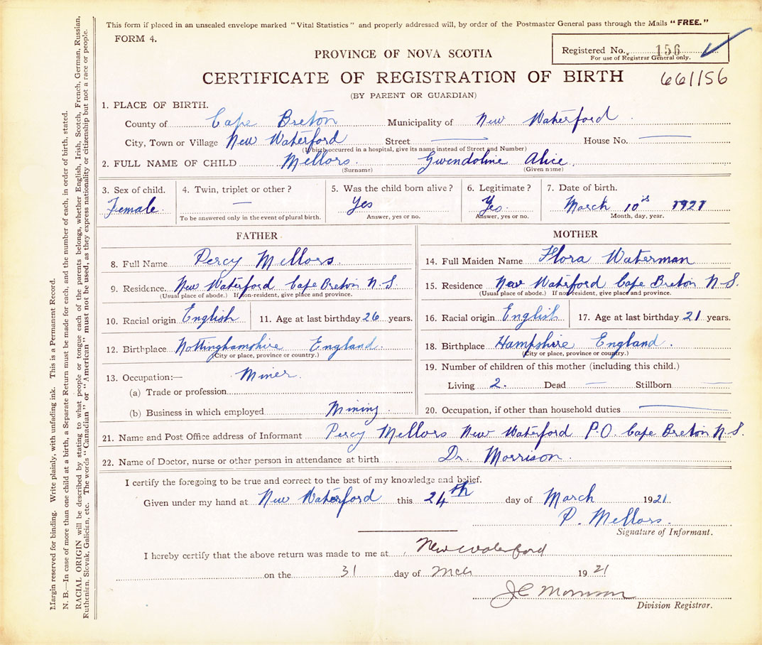 21. Name and Post Office address of Informant Percy Mellors New Waterford Post Office, Cape Breton