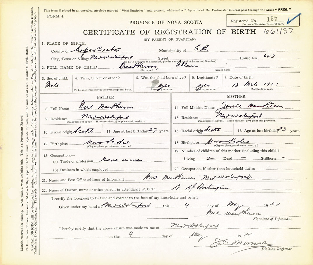 21. Name and Post Office address of Informant Neil MacPherson New Waterford