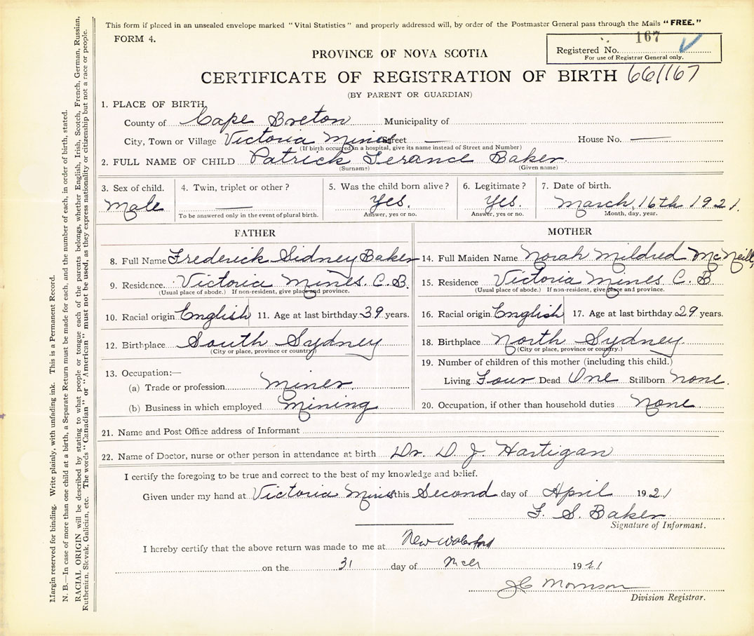 Male Birth Registration: Year: 1921 number: 66100167